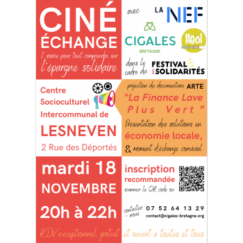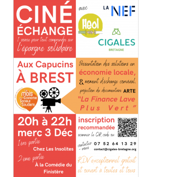 À l’occasion du Mois de l’Économie Sociale et Solidaire et dans le cadre du FESTISOL, les CIGALES de Bretagne s'associent aux sociétaires bénévoles de la banque éthique NEF et la monnaie locale HEOL pour vous proposer un