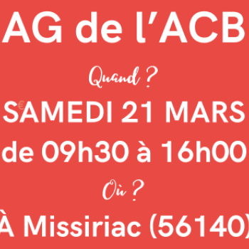 L'Assemblée Générale Extraordinaire et l'Assemblée Générale Ordinaire auront lieu le samedi 21 mars de 9h30 à 16h00 à Gîtes pour tous à Missiriac (56).