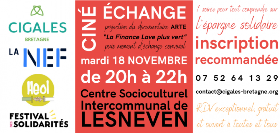 À l’occasion du Mois de l’Économie Sociale et Solidaire et dans le cadre du FESTISOL, les CIGALES de Bretagne s'associent aux sociétaires bénévoles de la banque éthique NEF et la monnaie locale HEOL pour vous proposer un